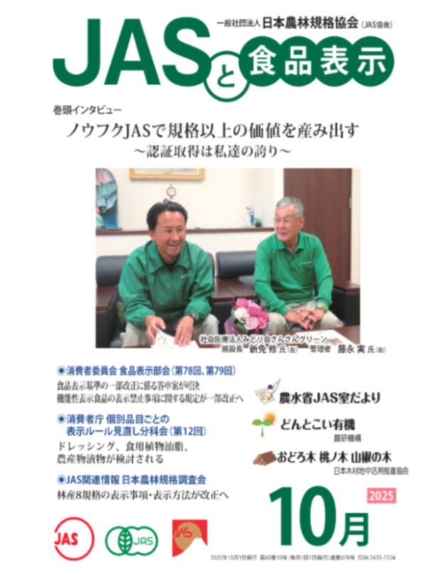 JASや食品表示に関するインタビューのほか、JASをめぐる最新の動向、農林水産省や消費者庁をはじめとする行政情報、協会のトピックス等最新情報を毎月掲載しています。
