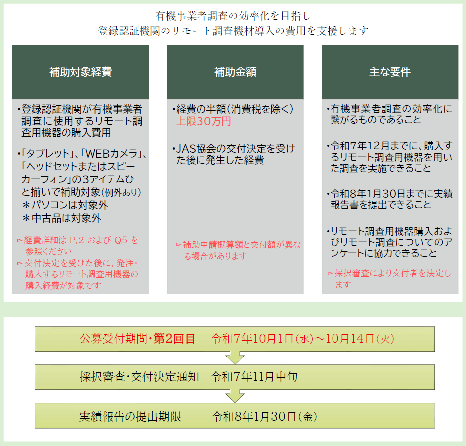 (A1)令和6年度補正予算JAS・食品安全マネジメントの普及対策事業として、登録認証機関が行う有機事業者調査の効率化を目指し、有機JAS認証取得、有機JAS資材リストへの登録支援、登録認証機関の検査員研修支援とともに行う補助事業です。有機JASの認証件数は年々増加傾向となっており、リモート調査は検査員1人当たりの検査件数を増加させることが期待されますが、リモート調査に対応していない認証機関もあります。その理由の一つとして、リモート調査用の機材をもっていないことがあげられています。本事業では、リモート調査用の機材購入費を補助し、この支援によって登録認証機関のリモート調査実施体制を整備して、認証事業者がリモート調査を受けられる環境を整えます。また、交付決定を受けた登録認証機関には、実績報告時にリモート調査の良い点や問題点に関する調査等へもご協力いただき、有機JAS制度のさらなる運用改善に活用します。